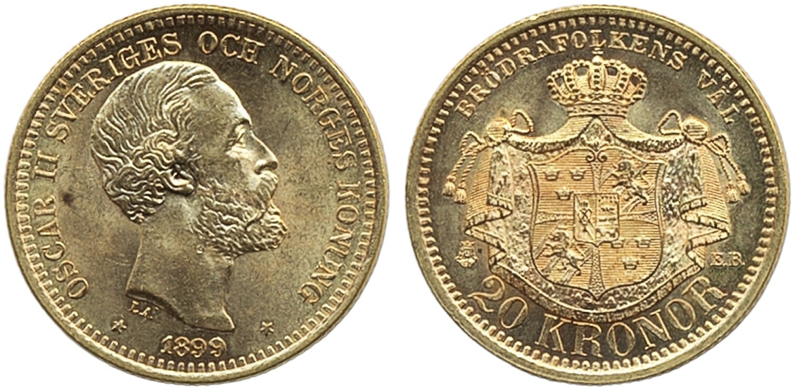 Coins, Sweden. Oskar II, MIS III.14, 20 kronor 1899. Two small spots. 01/0.