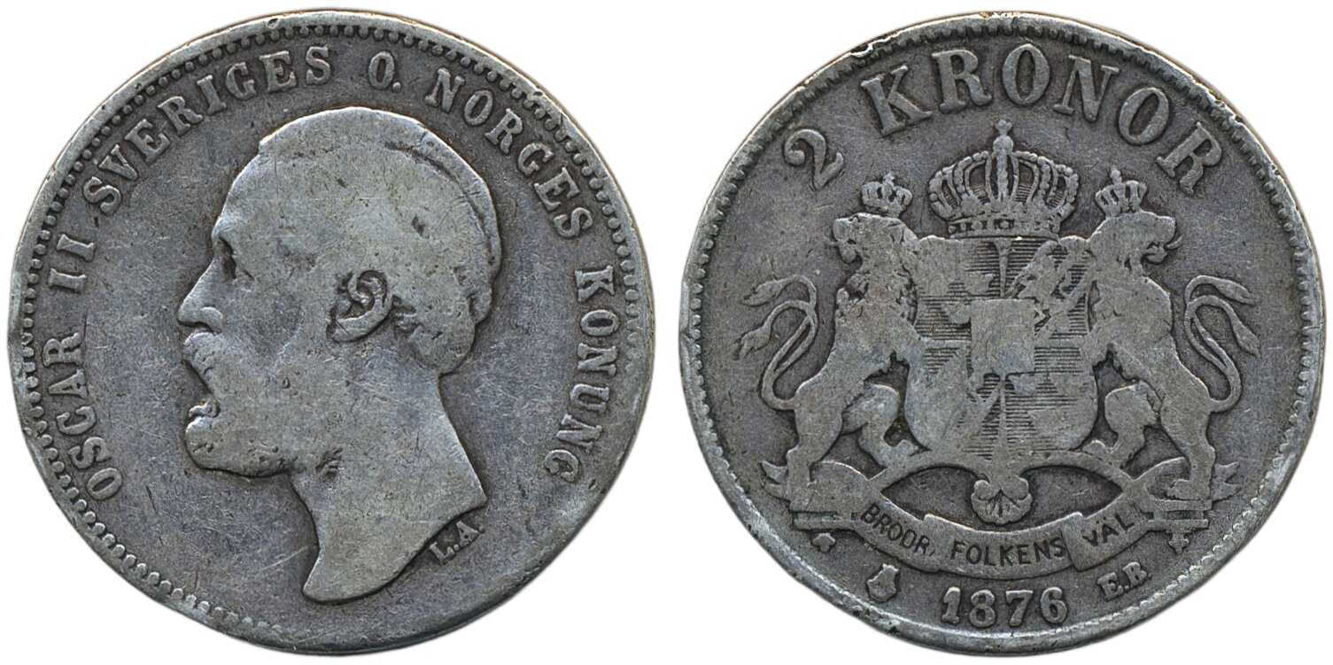 Coins, Sweden. Oskar II, MIS I.1b, 2 kronor 1876. Large date, small EB. Small rim nicks. 1?