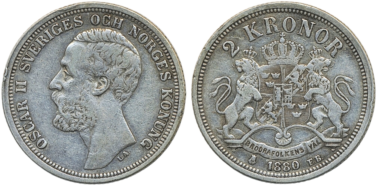 Coins, Sweden. Oskar II, MIS II.2, 2 kronor 1880. "OCH". 1.