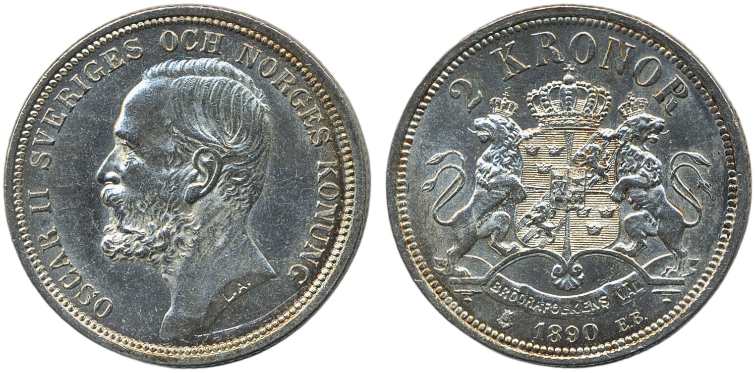 Coins, Sweden. Oskar II, MIS III.1, 2 kronor 1890. Obverse light hairlines. 01.