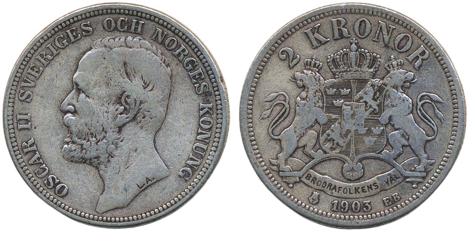 Coins, Sweden. Oskar II, MIS III.9, 2 kronor 1903. Portrait of 1898. 1.