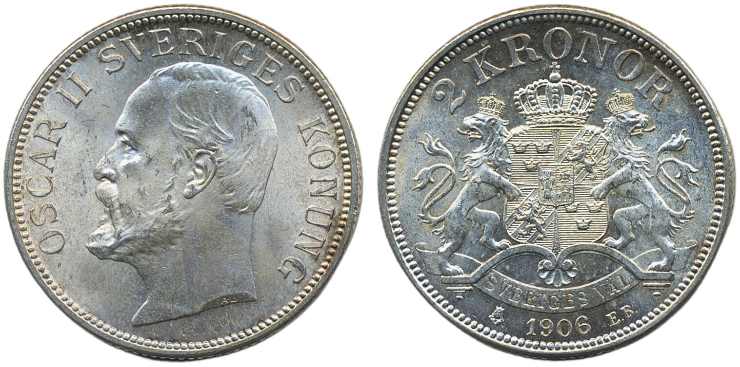 Coins, Sweden. Oskar II, MIS V.1, 2 kronor 1906. 01/0.