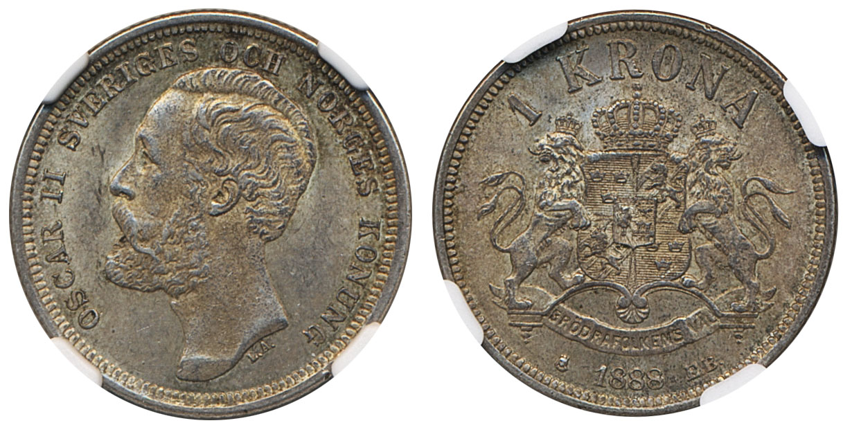 Coins, Sweden. Oskar II, MIS II.8, 1 krona 1888. Beautiful lustrous example with some contact marks. Natural toning. Graded by NGC as MS62, in our opinion conservatively so. 01. See certification at NGC