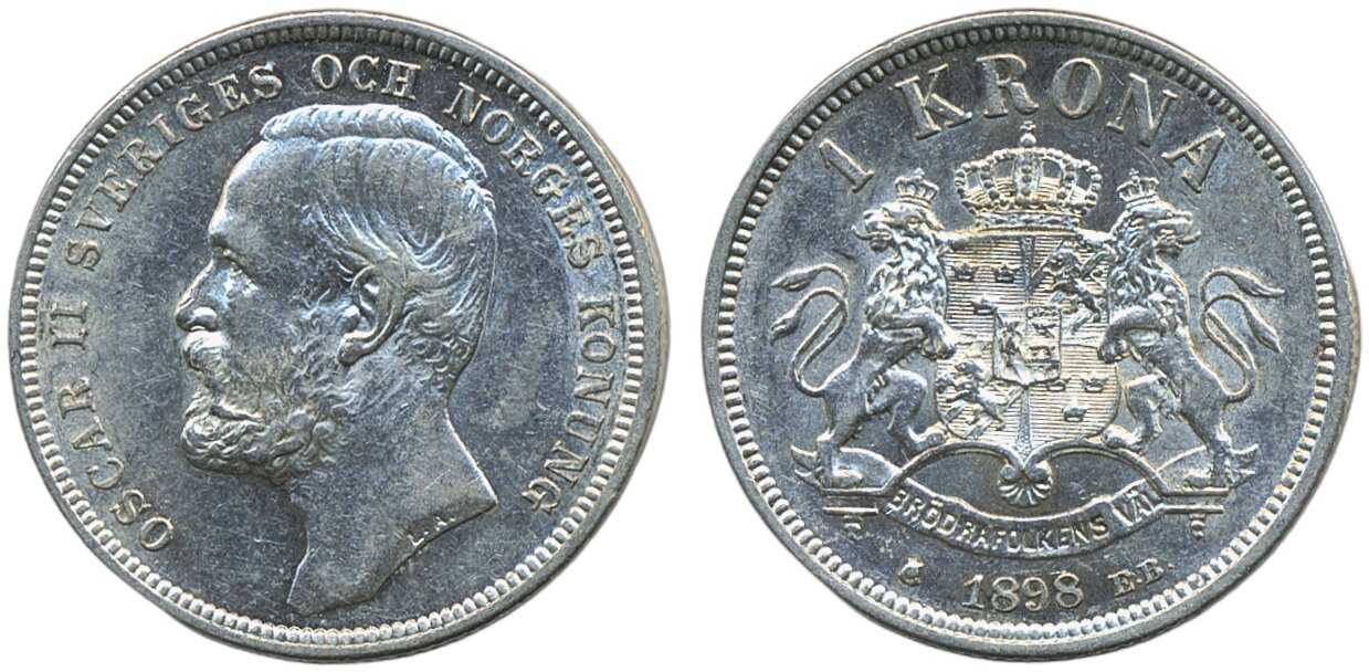 Coins, Sweden. Oskar II, MIS III.4, 1 krona 1898. Lightly cleaned. 1+/01.