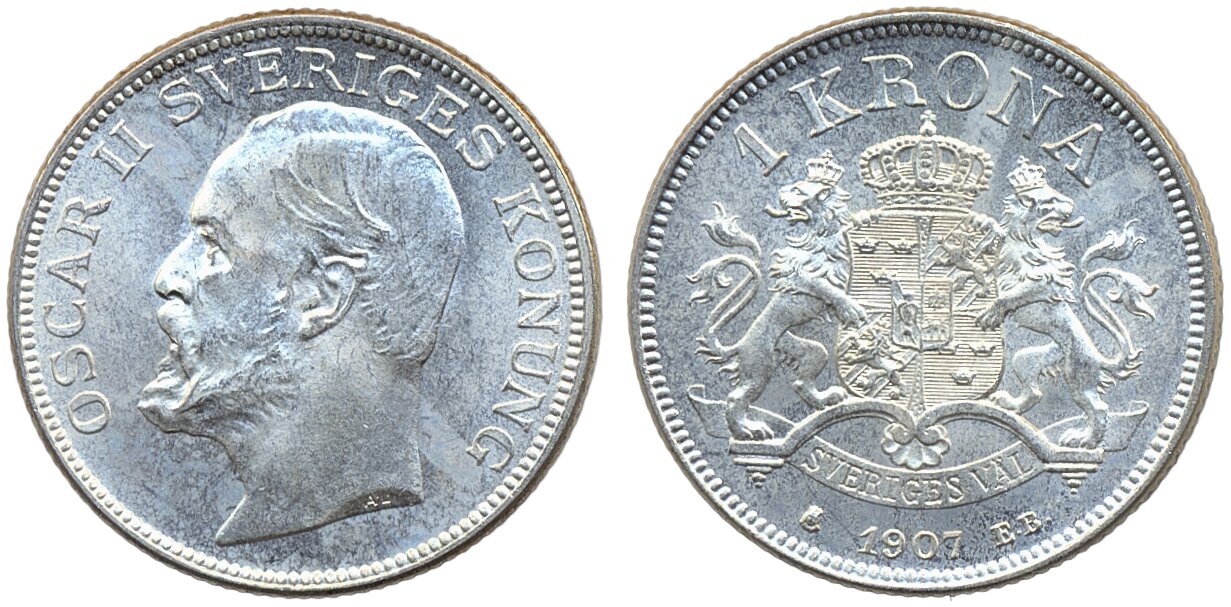Coins, Sweden. Oskar II, MIS IV.2, 1 krona 1907. 01/0.