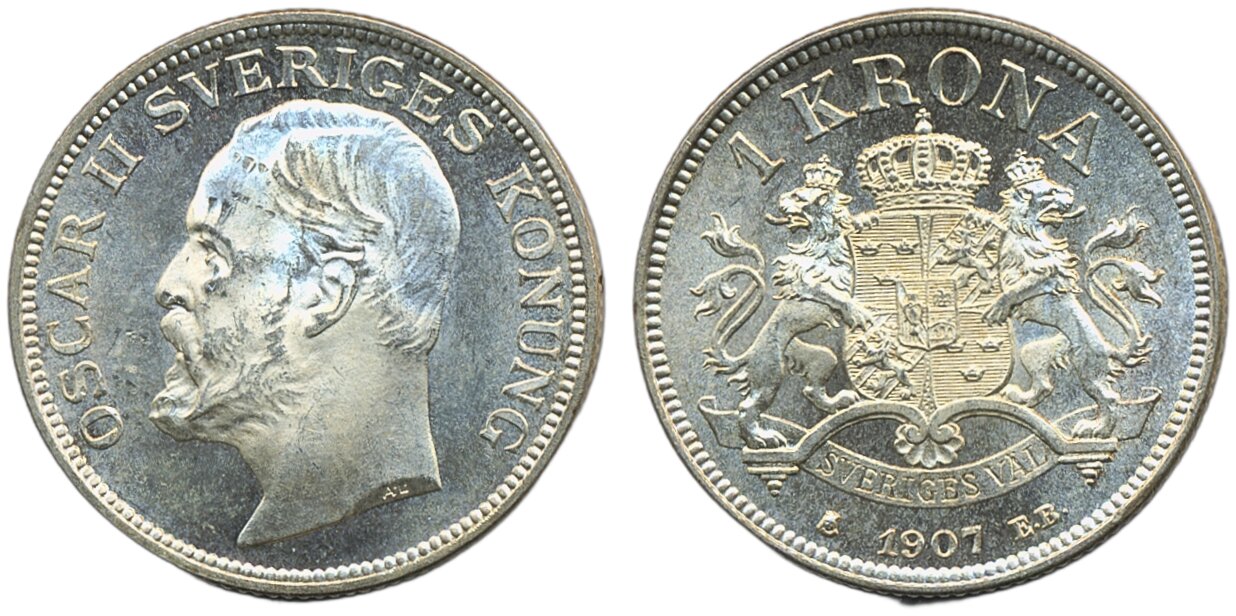Coins, Sweden. Oskar II, MIS IV.2, 1 krona 1907. 01/0.