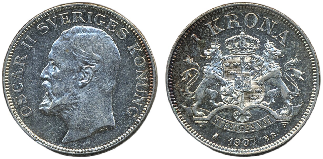 Coins, Sweden. Oskar II, MIS IV.1, 1 krona 1907. 7.5 g. 01.