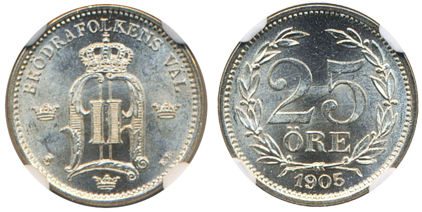 Coins, Sweden. Oskar II, MIS II.16a, 25 öre 1905. Graded by NGC as MS65. 0. See certification at NGC