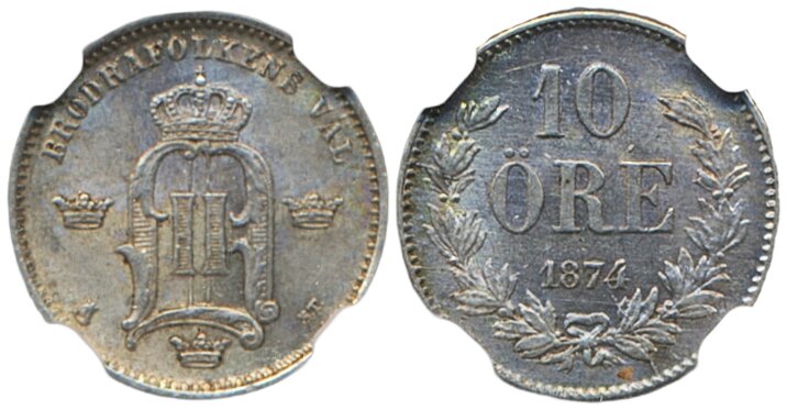Coins, Sweden. Oskar II, MIS I.1, 10 öre 1874. Graded by NGC as MS63. 01/0. See certification at NGC