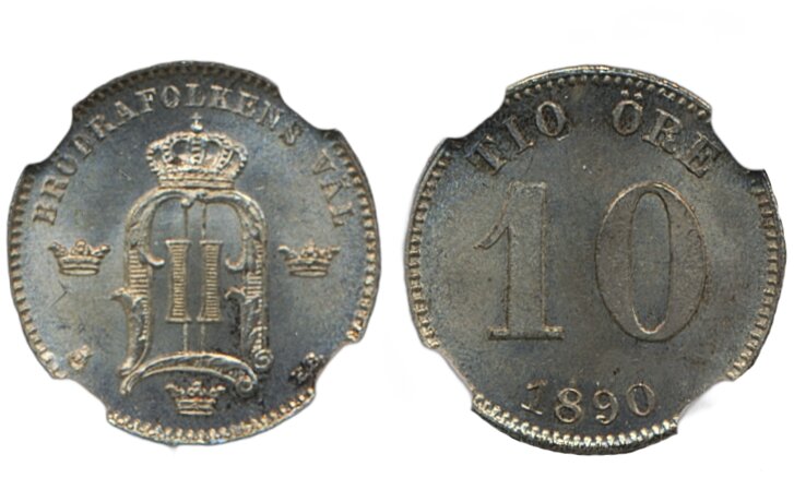 Coins, Sweden. Oskar II, MIS II.8, 10 öre 1890. Graded by NGC as MS65. 01/0. See certification at NGC