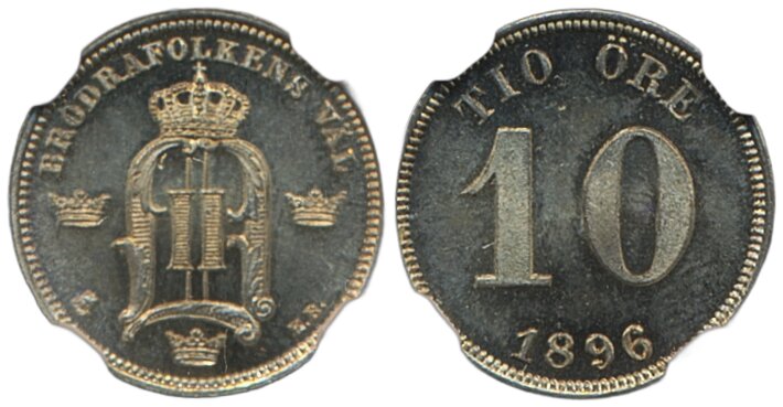 Coins, Sweden. Oskar II, MIS II.13, 10 öre 1896. Graded by NGC as MS65. 0. See certification at NGC