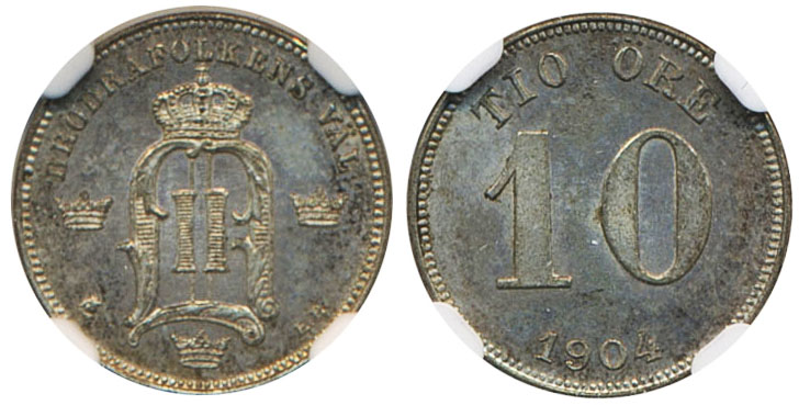 Coins, Sweden. Oskar II, MIS II.20a, 10 öre 1904. Graded by NGC as MS65. 01/0. See certification at NGC