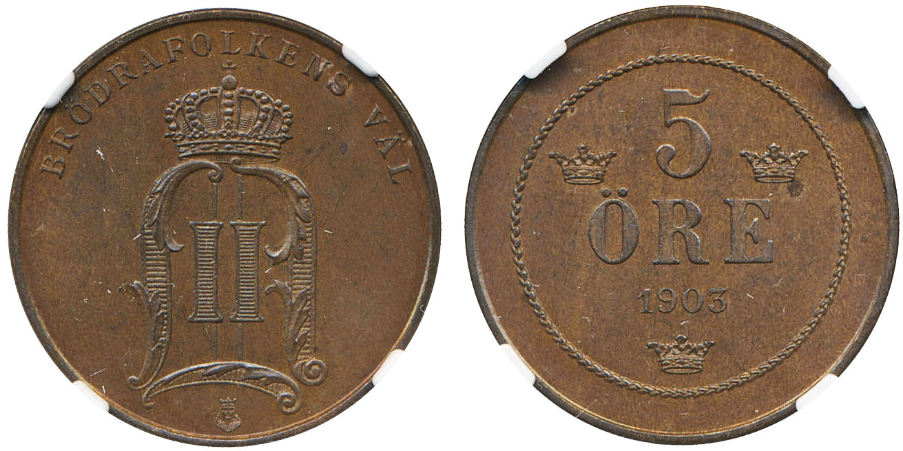 Coins, Sweden. Oskar II, MIS II.36, 5 öre 1903. Graded by NGC as MS64 BN. 01/0. See certification at NGC