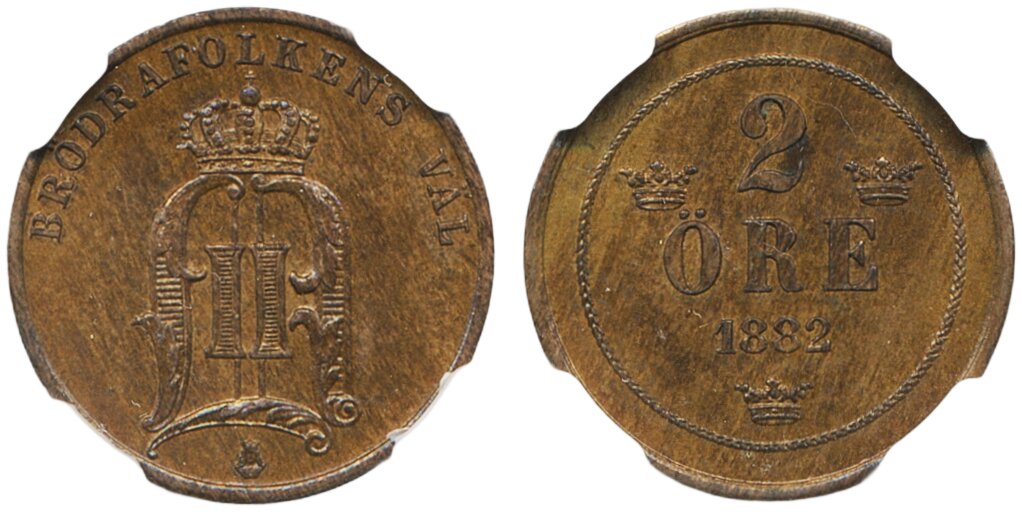 Coins, Sweden. Oskar II, MIS II.8, 2 öre 1882. Graded by NGC as MS62 BN. 01/0. See certification at NGC
