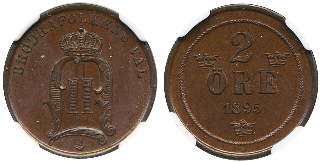 Coins, Sweden. Oskar II, MIS II.24a, 2 öre 1895. Graded MS64 BN by NGC. 01/0. See certification at NGC