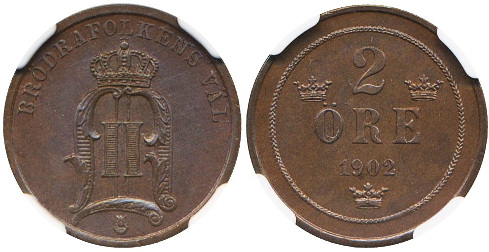 Coins, Sweden. Oskar II, MIS II.33, 2 öre 1902. Graded by NGC as MS65 BN. 01/0. See certification at NGC