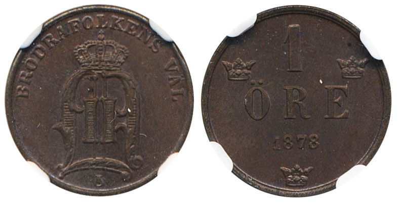 Coins, Sweden. Oskar II, MIS II.2, 1 öre 1878. Graded MS64 BN by NGC. 01/0. See certification at NGC