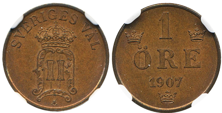 Coins, Sweden. Oskar II, MIS IV.2, 1 öre 1907. Graded MS65 BN by NGC. 01/0. See certification at NGC