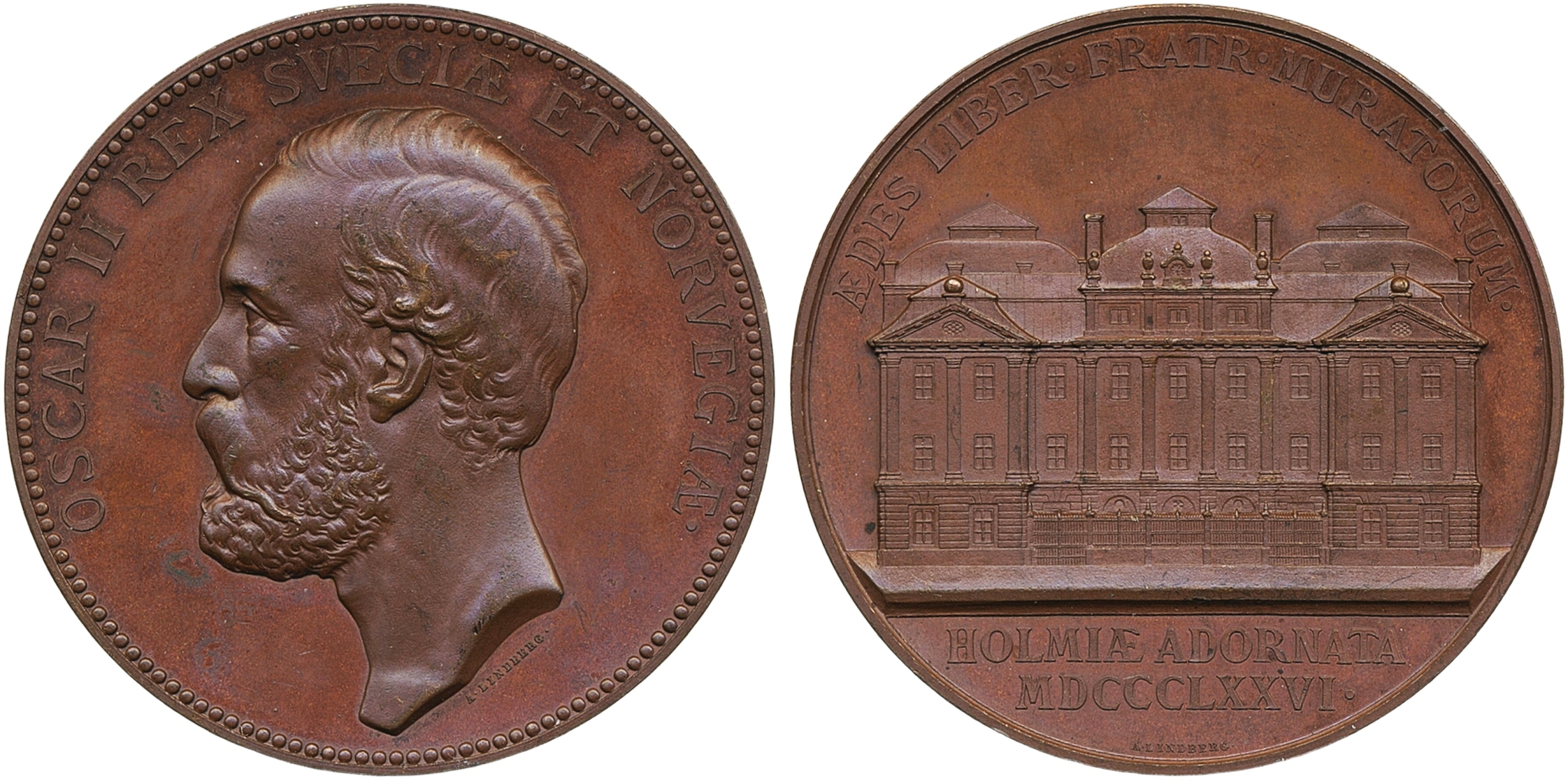 Medals, regal, Sweden. Oskar II, NM 13:94:11, The Masonic lodge in Stockholm 1877. Medal in bronze, 56 mm, 67.4 g., by A. Lindberg. Anderberg 21. 01.