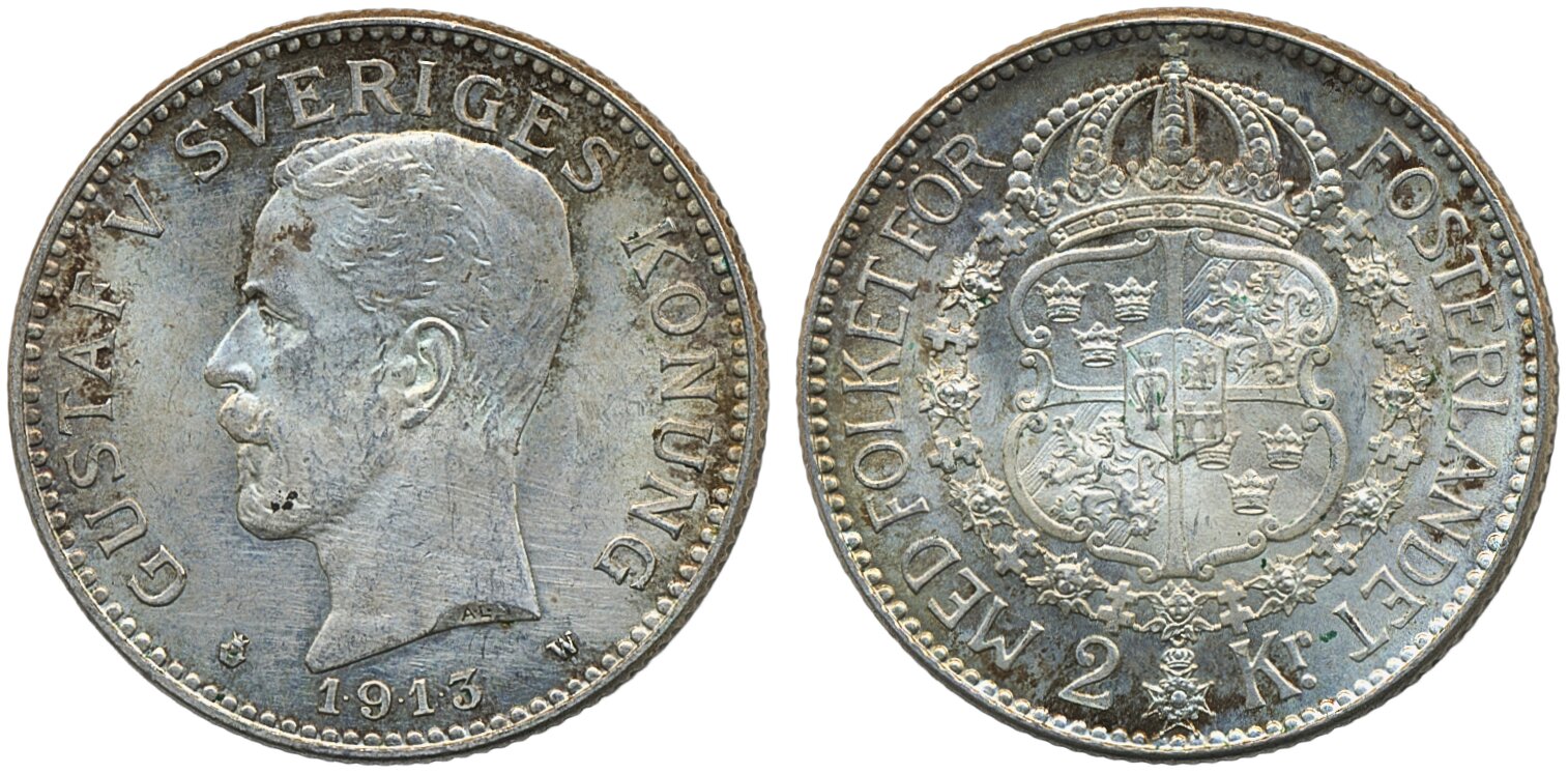 Coins, Sweden. Gustav V, MIS I.4, 2 kronor 1913. Obverse with slight hairlines, else attractive original toning. 01/0.