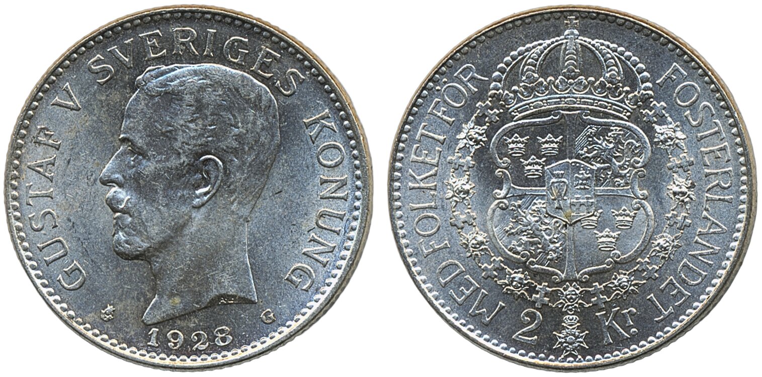 Coins, Sweden. Gustav V, MIS I.10, 2 kronor 1928. 01/0.