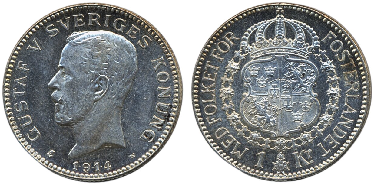 Coins, Sweden. Gustav V, MIS I.4a, 1 krona 1914. 01/0.