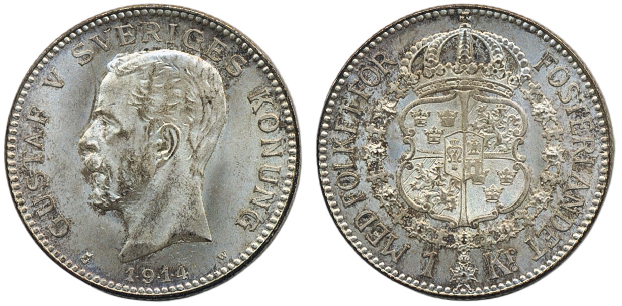 Coins, Sweden. Gustav V, MIS I.4a, 1 krona 1914. W with two crossbars. 01/0.