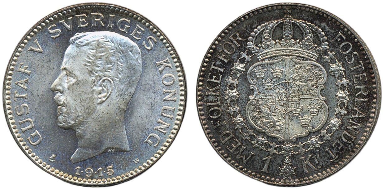 Coins, Sweden. Gustav V, MIS I.5c, 1 krona 1915. W with three crossbars. 01/0.