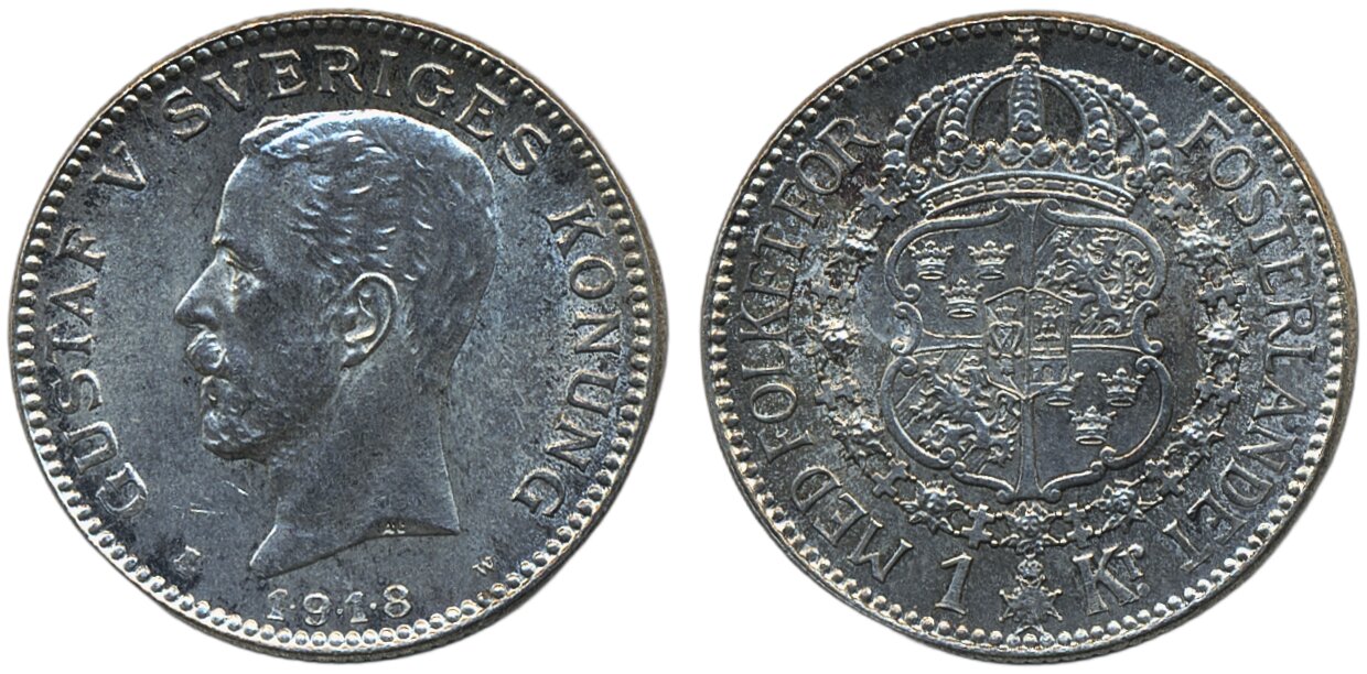 Coins, Sweden. Gustav V, MIS I.7, 1 krona 1918. Good 01.