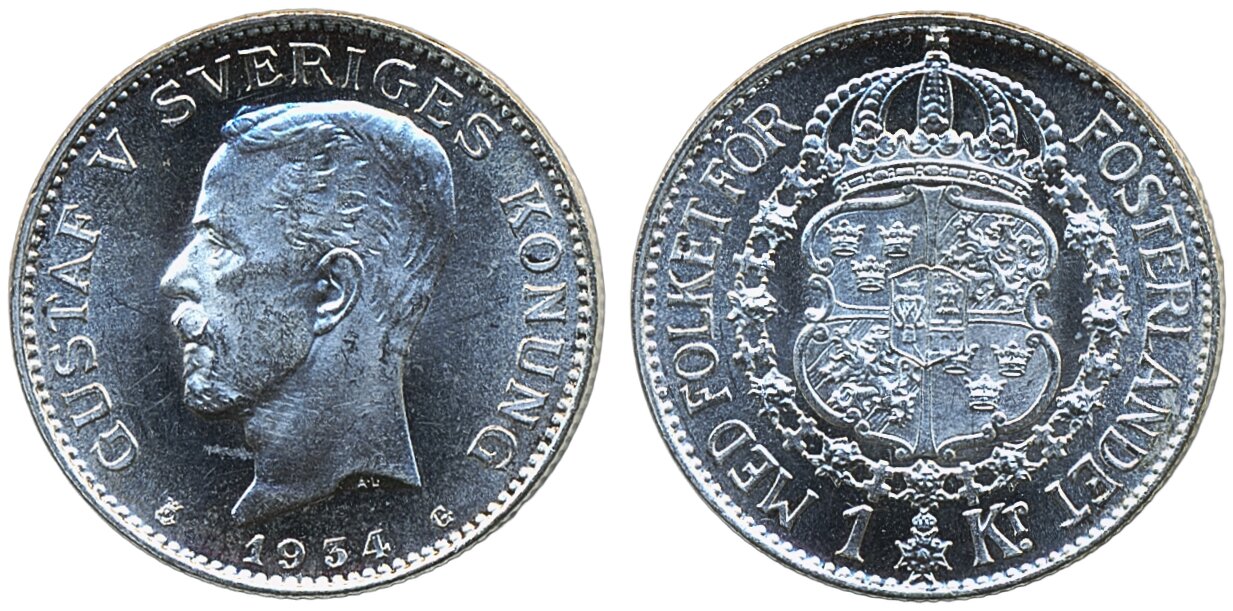 Coins, Sweden. Gustav V, MIS I.20, 1 krona 1934. Mirror-like surfaces. 0.