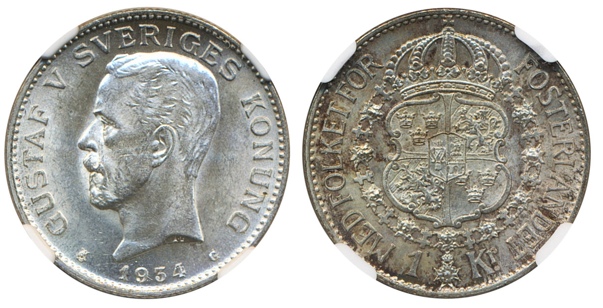 Coins, Sweden. Gustav V, MIS I.20, 1 krona 1934. Graded MS63 by NGC. 01/0. See certification at NGC