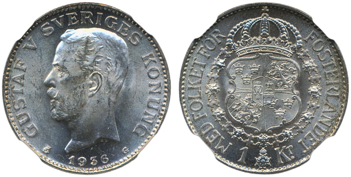 Coins, Sweden. Gustav V, MIS I.21, 1 krona 1935. Graded MS64 by NGC. 01/0. See certification at NGC