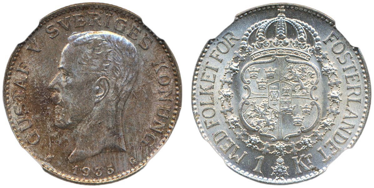 Coins, Sweden. Gustav V, MIS I.22, 1 krona 1936. Graded MS64 by NGC. 01/0. See certification at NGC