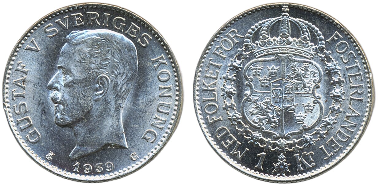 Coins, Sweden. Gustav V, MIS I.25c, 1 krona 1939. Large G. 01/0.
