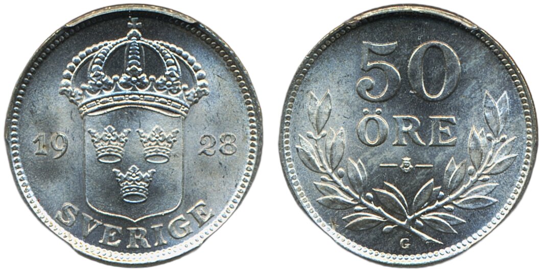 Coins, Sweden. Gustav V, MIS I.7, 50 öre 1928. Graded by PCGS as MS65. 01/0. See certification at PCGS