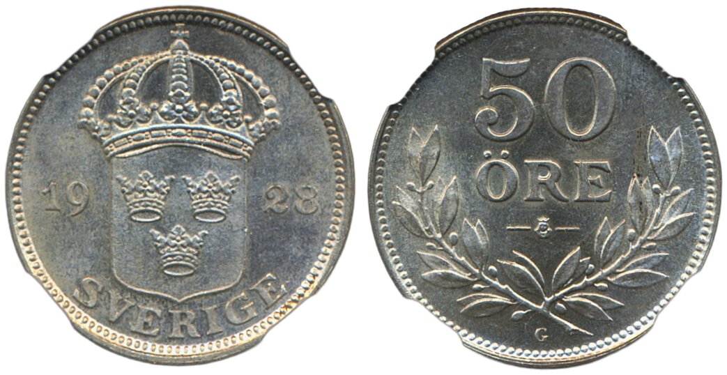 Coins, Sweden. Gustav V, MIS I.7, 50 öre 1928. Graded MS64 by NGC. 01/0. See certification at NGC