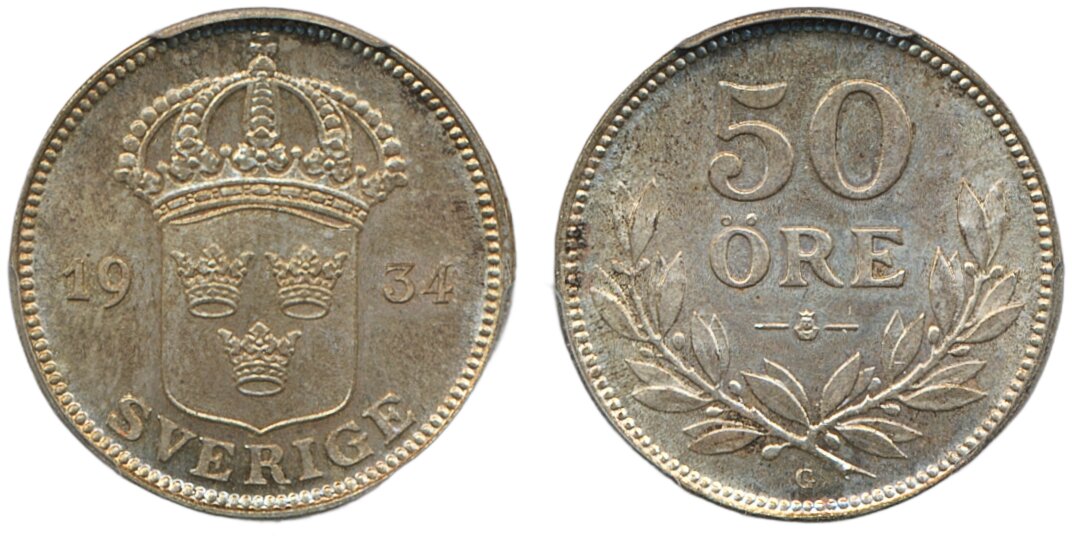 Coins, Sweden. Gustav V, MIS I.12, 50 öre 1934. Graded by PCGS as MS65. Tied highest graded by PCGS. 01/0. See certification at PCGS