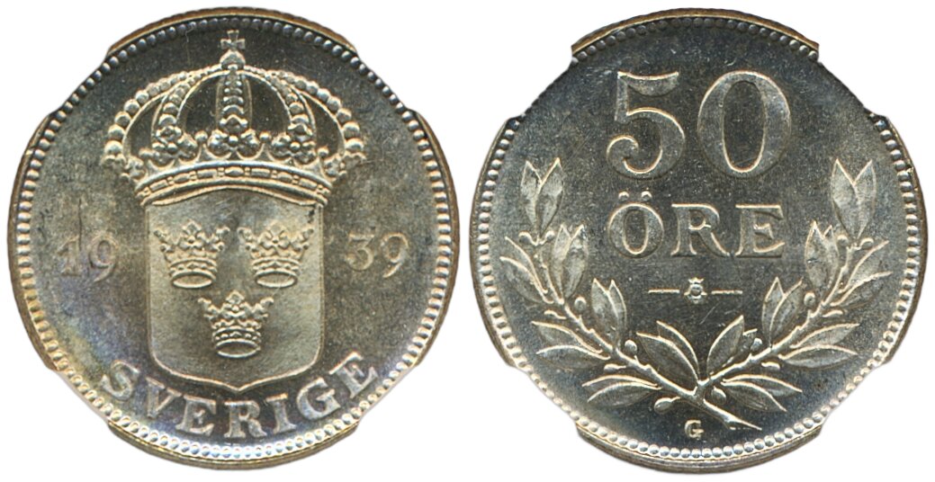 Coins, Sweden. Gustav V, MIS I.16, 50 öre 1939. Graded MS65 by NGC. 01/0. See certification at NGC
