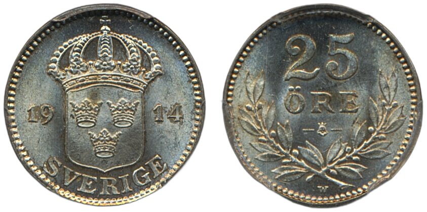 Coins, Sweden. Gustav V, MIS I.3, 25 öre 1914. Graded MS66 by PCGS. 0. See certification at PCGS