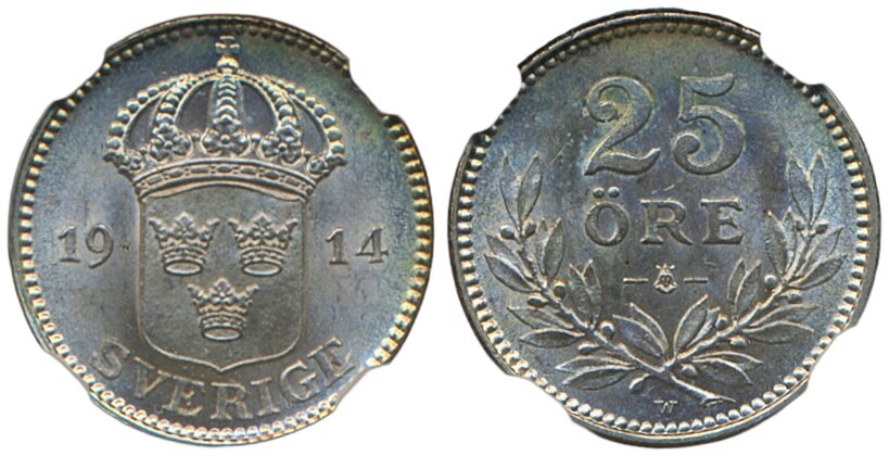 Coins, Sweden. Gustav V, MIS I.3, 25 öre 1914. Graded by NGC as MS65. 0. See certification at NGC