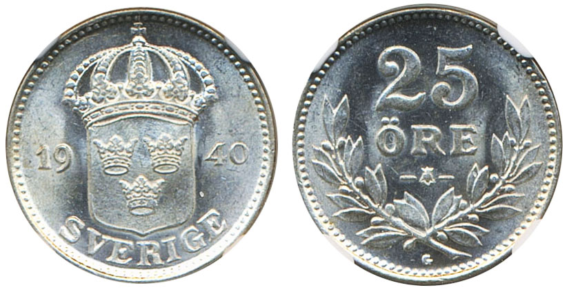 Coins, Sweden. Gustav V, MIS I.20a, 25 öre 1940. Graded MS65 by NGC. 0. See certification at NGC