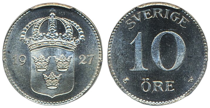 Coins, Sweden. Gustav V, MIS I.10, 10 öre 1927. Graded MS65 by PCGS. 01/0. See certification at PCGS