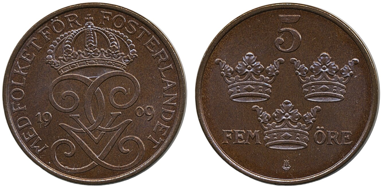Coins, Sweden. Gustav V, MIS I.1a, 5 öre 1909. 0.