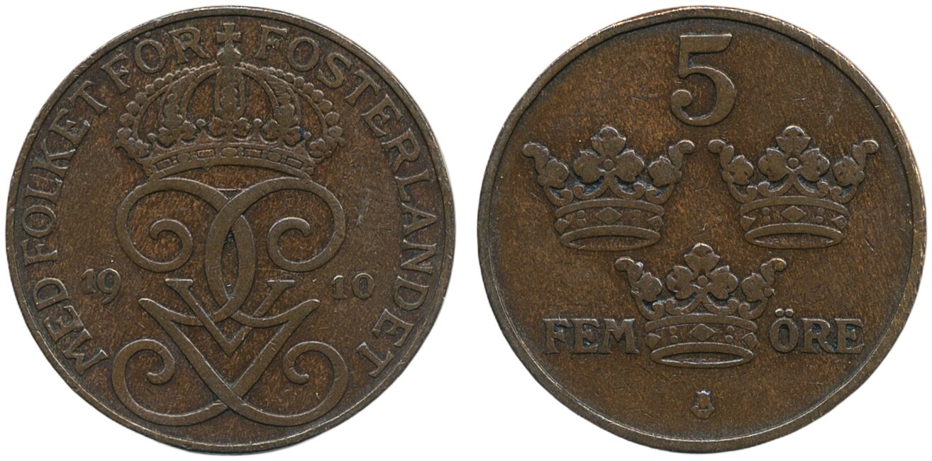 Coins, Sweden. Gustav V, MIS I.2, 5 öre 1910. 1.