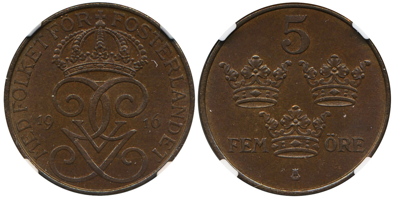 Coins, Sweden. Gustav V, MIS I.8c, 5 öre 1916. Long 6. Graded by NGC as MS64 BN. 01/0. See certification at NGC