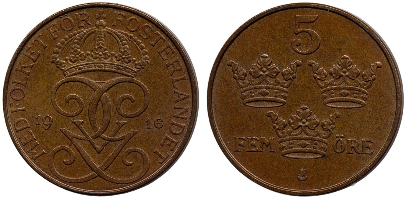 Coins, Sweden. Gustav V, MIS I.8a, 5 öre 1916/5. 01/0.
