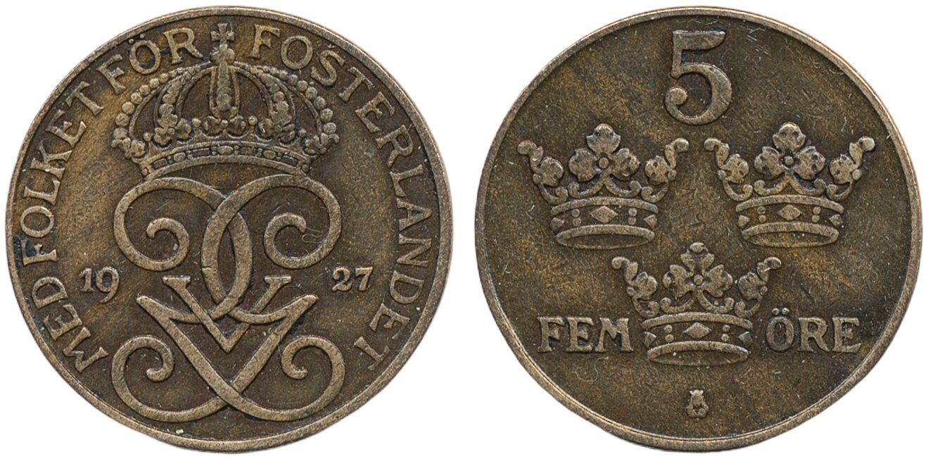 Coins, Sweden. Gustav V, MIS I.18, 5 öre 1927. 1.