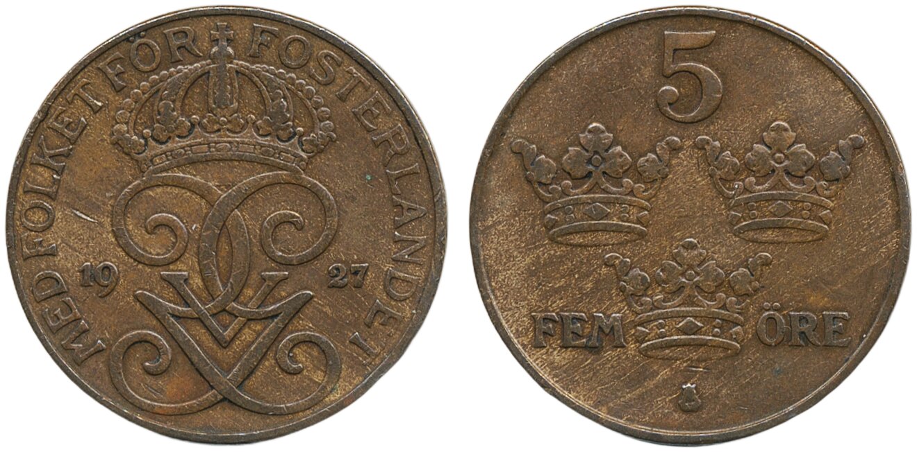 Coins, Sweden. Gustav V, MIS I.18, 5 öre 1927. 1.