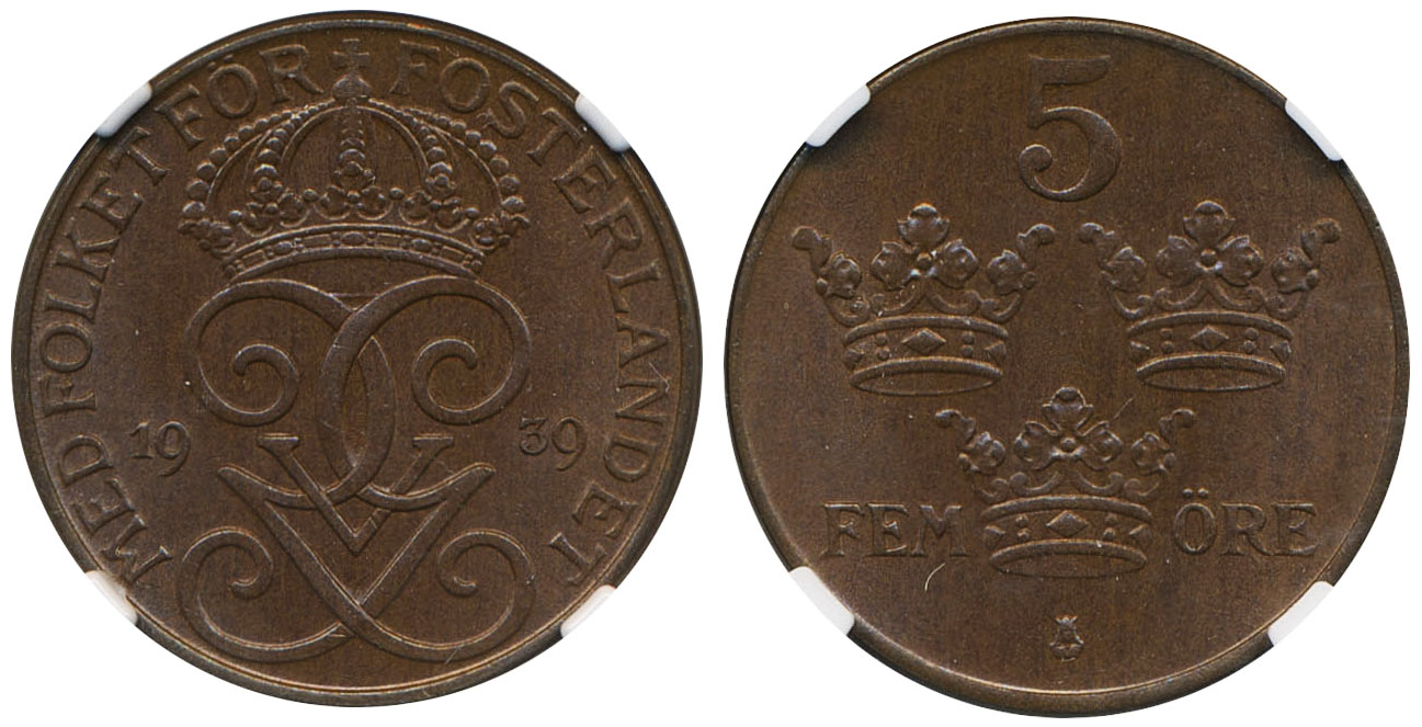 Coins, Sweden. Gustav V, MIS I.30, 5 öre 1939. Graded as MS65 BN by NGC. 0. See certification at NGC