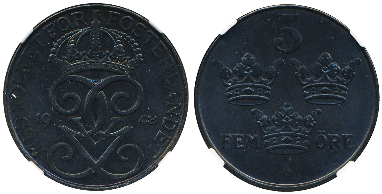 Coins, Sweden. Gustav V, MIS II.11, 5 öre 1948. Graded by NGC as MS66. 0. See certification at NGC